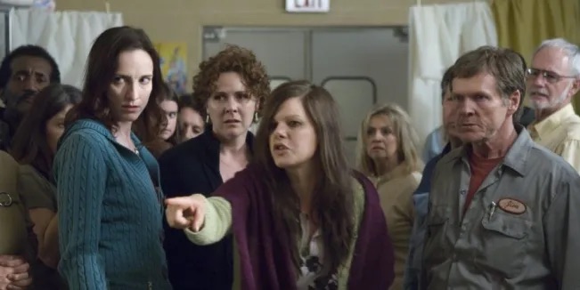 In the aftermath of a devastating thunderstorm, a mysterious mist rolls into the town of Bridgton, Maine, bringing with it a menagerie of otherworldly monsters. Anyone unlucky enough to be caught in it does not last long. Trapped inside Food House grocery as the mist rolls in are a ragtag group that includes local artist David Drayton (Thomas Jane) and his son Billy, litigious neighbor Brent Norton (the great Andre Braugher), schoolteacher Amanda Dunfrey (The Walking Dead’s Laurie Holden), and the zealous Mrs. Carmody (a particularly terrifying Marcia Gay Harden) among other assorted store clerks, townsfolk, and soldiers. (Folks, we got ourselves a microcosm!) As the mist covers all, and the store’s inhabitants sort themselves into rival factions, the one thing that’s clear is that what’s happening outside the disconcertingly thin glass of the store’s window-lined façade is not the only danger.