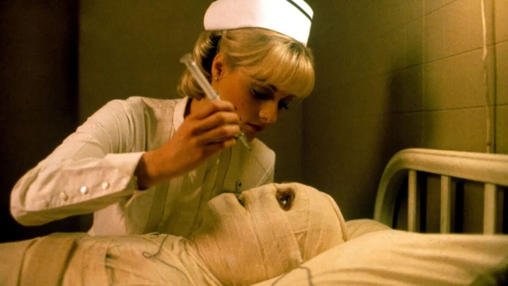 Grad student Helen Lyle (Virginia Madsen) runs afoul of the titular hook-handed specter while researching urban legends and folk tales for her doctoral thesis with her research partner and best friend Bernadette Walsh (Kasi Lemmons). Diving headlong down the rabbit-hole of racial and economic inequality and the evils visited upon African Americans in the years after the Civil War, during and after Reconstruction, and how that evil still plays out today (both in the year the film was released and unfortunately still upon this writing, which is why the sequel/reboot from 2021 works so well, and you should see it if you haven’t) Helen becomes obsessed by the story of the Candyman, alienating her husband and her friends with her increasing belief in the actual, really for real, not just a boogeyman meant to explain away the poverty and violence in which the people of Cabrini Green live, real life Candyman. When her belief leads her to say his name in a mirror, she finds her obsession reflected back at her.